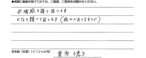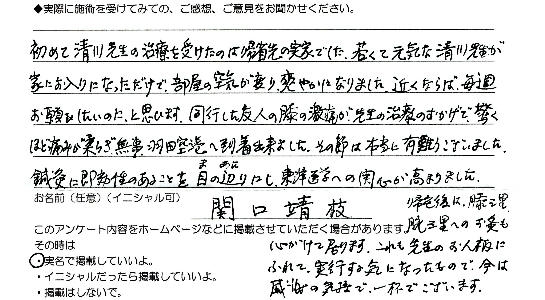 鎌倉にお住いの関口さんは帰郷時、疲れから体調を崩され困られている時にお知り合いからのご紹介で治療させていただくこととなりました。治療の翌日に感謝のお電話とともに同行されていた方の膝の調子が悪いとのことでそちらも対応させていただきました。鎌倉に帰られた後もご丁寧にお電話を頂き、私も治療家として最高のお褒めを頂き感謝している次第です!