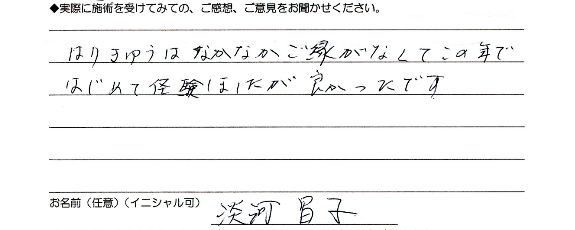 ヘルパーさんのご紹介で膝関節の痛みに対する治療をさせていただいております。最初は『ハリは痛いんじゃないか』と不安を持たれてましたが【無料体験】でご説明させていただくとともに実際にハリをお見せしたら『こんなに細いの!?』と驚かれ、安心して治療を受けていただいております。