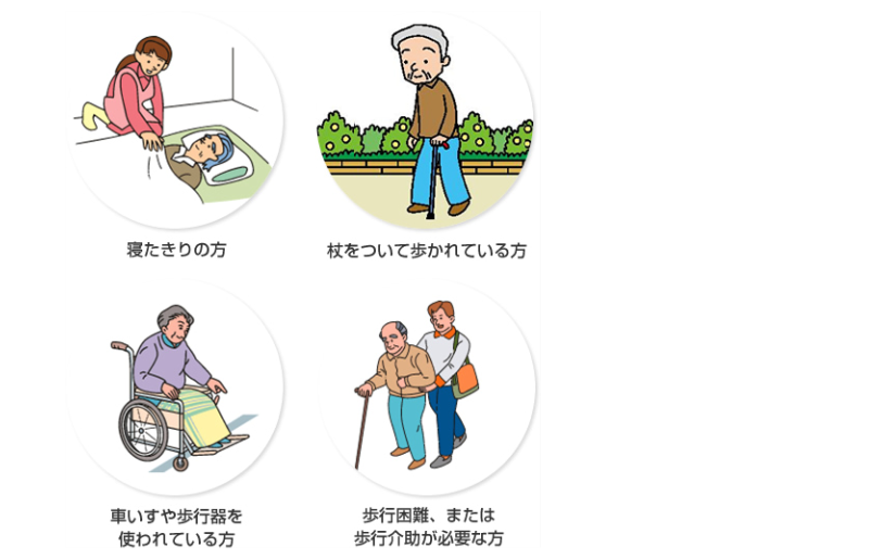 何の助けもなく自分一人の力では、歩いて階段を上り下りして治療院に来られない。 が、大まかなめやすです。 ・寝たきりの方 ・杖をついて歩かれる方 ・車いすや歩行器を使われる方 ・付き添いなしでは外出できない方 は、訪問リハビリ鍼灸の対象となります。